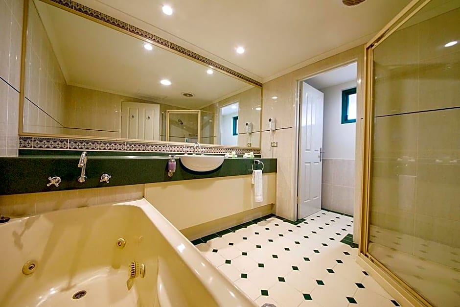 This suite has a spa bath and a balcony with views of the picturesque golf course.